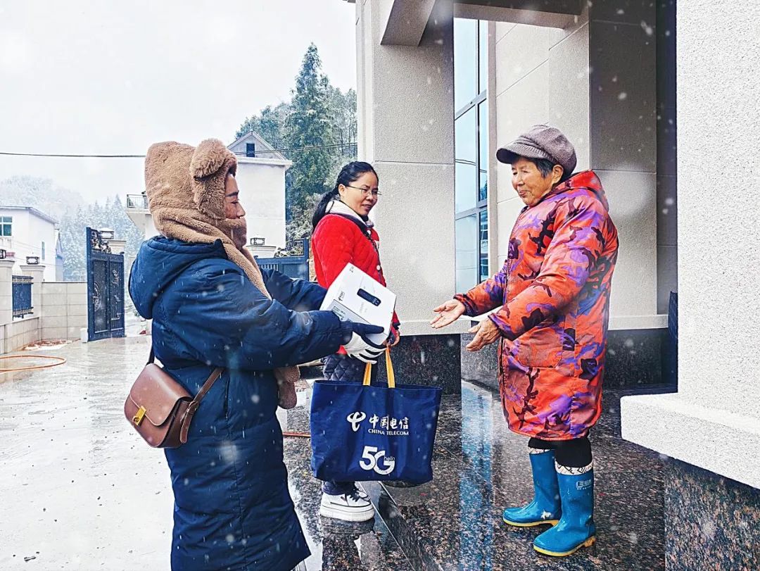在温州文成县,电信营业员刘林菊和装维工程师黄海,因已提前与客户预约好服务时间,即便顶着风雪,也依然守约及时上门为用户解决网络问题。