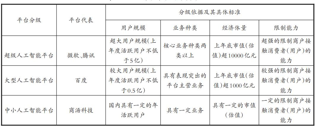 何为算法?各类学说众说纷纭。其一,从语义角度看,算法最早来源于古希腊语αριθμó(寓指“计算的方法”),我国西汉《周髀算经》便有对算法的记载。其二,从计算机学科角度看,算法以各种智能终端作为信息载体,以二进制作为计算数制,被广泛应用于匹配、加密等场景。算法没有形成统一定义,但算法通常被视为在有限且明确的操作步骤内,将形式规范的输入值(Inputs)转化为输出值(Outputs)的技术,旨在减少计算机运行速度与存储空间的技术限制,提升计算机完成任务的综合效率。超级人工智能平台的技术基础是算法技术,正因为算法技术的迭代创新,才促进了超级人工智能平台快速发展。但是,何为超级人工智能平台?参照国家市场监管总局2021年颁布的《互联网平台分类分级指南(征求意见稿)》,其按照用户规模、业务种类、经济体量与限制能力的标准将平台分类为超级平台、大型平台与中小平台。同理,人工智能平台可以依据分级标准而划分为三类平台:超级、大型与中小型人工智能平台(参见下表1)。其中,超级人工智能平台可以被界定为兼具超大用户规模(年活跃用户数不得低于5亿人)、超广业务种类(核心业务种类不得低于两类)、超高经济体量(市值或估值不得低于1000亿元)、超强限制能力(超强的限制商户接触消费者的能力)的人工智能平台。在AIGC的时代环境下,算法技术的发展程度更深,应用场景更加复杂,超级人工智能平台可以利用其资源禀赋(海量的数据基础、强大的算力支持、雄厚的算法技术等),运行事先设计好的、嵌入平台模型的代码程序,通过“输入—执行指令—输出”的固定运行模式,实现特定人工智能场景下的“帕累托最优”。