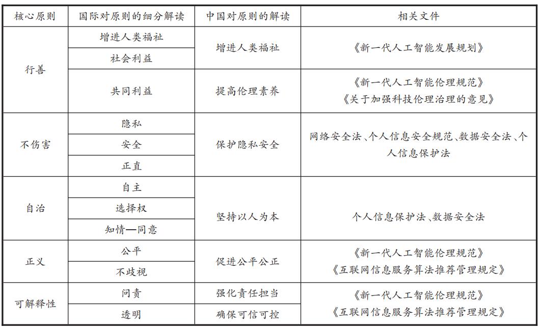 表2 对人工智能伦理原则的国际解读比较及相关文件
