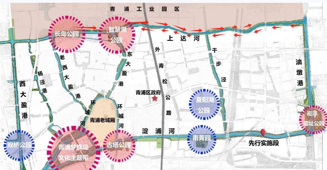 -城市向北发展,将来的综合城市中央滨河带。周边为融合商业,办公、居住,工业的多元化综合城市区域。依托上达河生态水系,结合青浦城区未来发展,打造集休闲娱乐、商业服务、文化体验于一体的城市滨水商业核心绿廊。