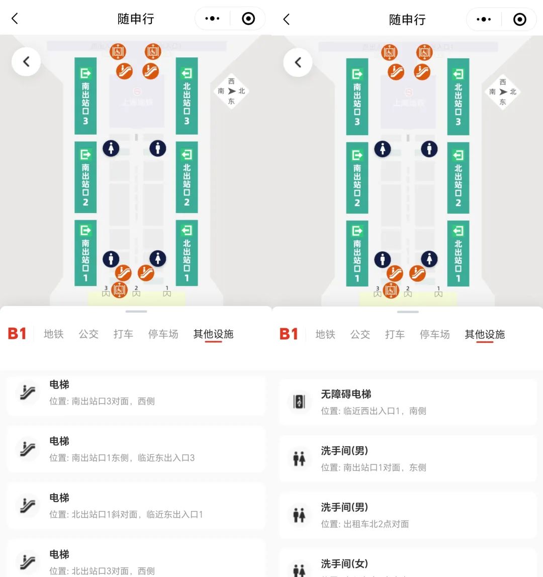 PS:对虹桥站内公共设施不了解的旅客,点击站内指引后,选择其他设施,即可看到电梯、无障碍电梯、洗手间的地图和具体位置