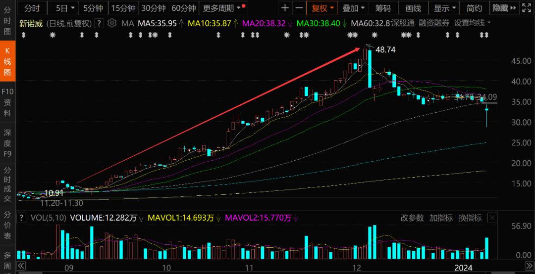 从新诺威的股价走势图可以看出,其在2023年9月份之前走势基本是横盘状态,但从9月份开始,其股价就开始了单边大涨之路,一口气从13元左右涨到了12月初的48元以上,短短三个月涨幅高达近300%!