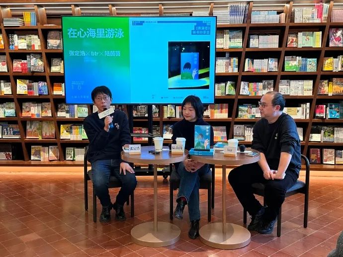 活动现场,左起为张定浩、陆茵茵与 btr。