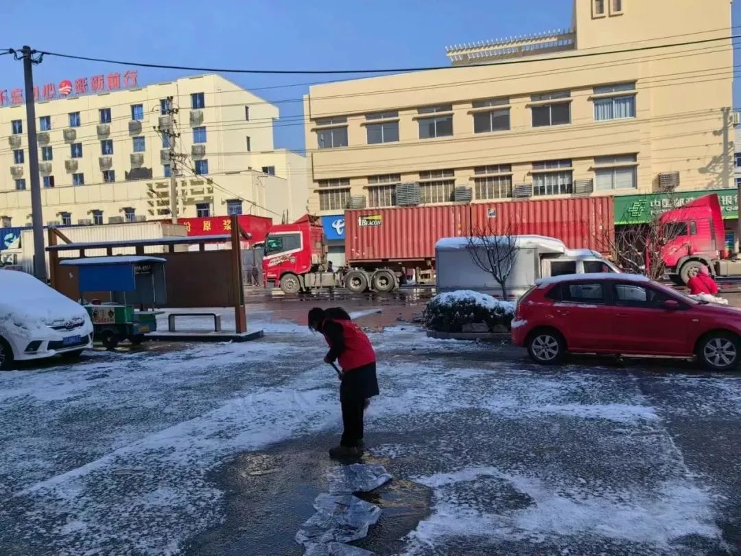三门农商银行珠岙支行组织巾帼志愿者们主动提早1小时到达岗位,分头清扫附近街区的积雪和暗冰,在冰天雪地中为群众铲出一条“安心路、便民路”。