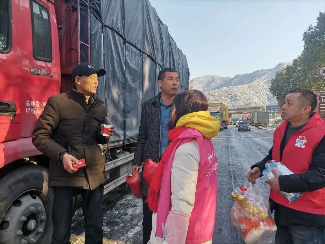 珠岙镇妇联迅速组织巾帼志愿者,联合三门农商银行珠岙支行,凝心聚力,为滞留一夜的货车司机们送上了贴心的早饭和热气腾腾的开水,耐心安抚滞留人员情绪,询问车主需求,尽力提供帮助,用实际行动让司机们感受到了珠岙镇党委政府的关怀和妇联的“巾帼温度”。