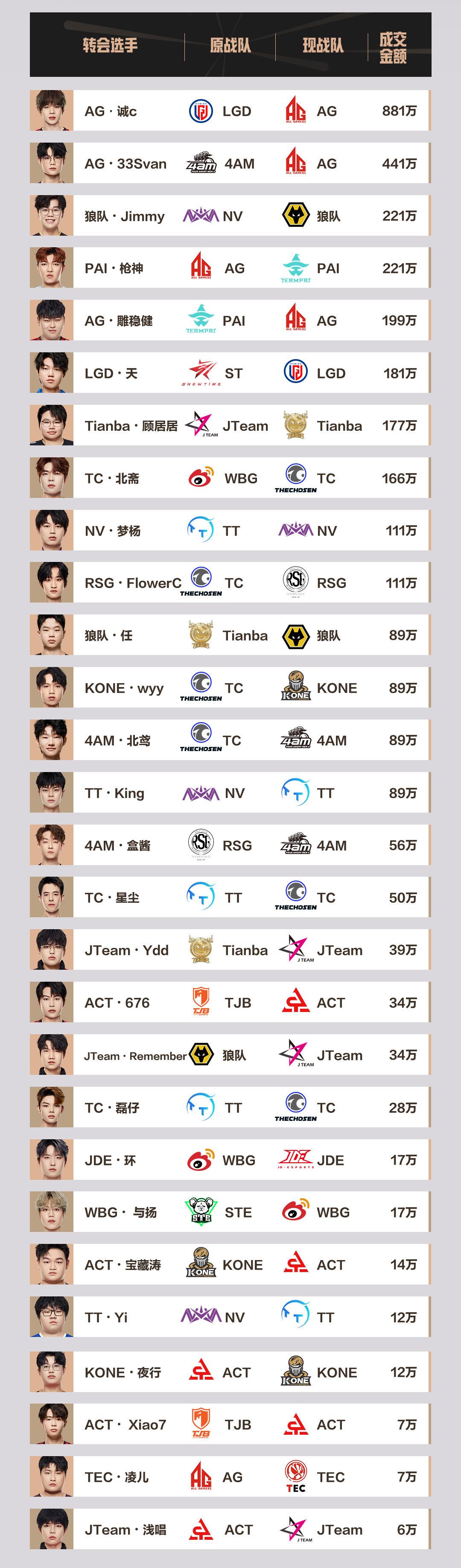 PEL这边,成都AG花费1521万进行了阵容的调整,涉及引入实力选手诚c、33Svan以及雕稳健。KPL那边最重磅的转会自然要属从重庆狼队转会到济南RW侠的Fly,虽然官方并未公布具体的转会金额,但Fly本人连同商务都随之转到新队伍,想必大家心中都有一个很高的数字。