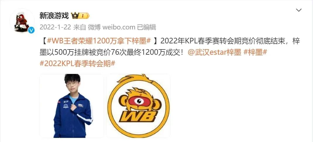 一年之后的2022KPL春季赛转会期,梓墨以1200万的价格从武汉eStarPro转会到北京WB,成为又一名千万级KPL选手。据悉,梓墨的挂牌价格为500万,历经76次竞价之后,最终以1200万的价格被北京WB拿下。