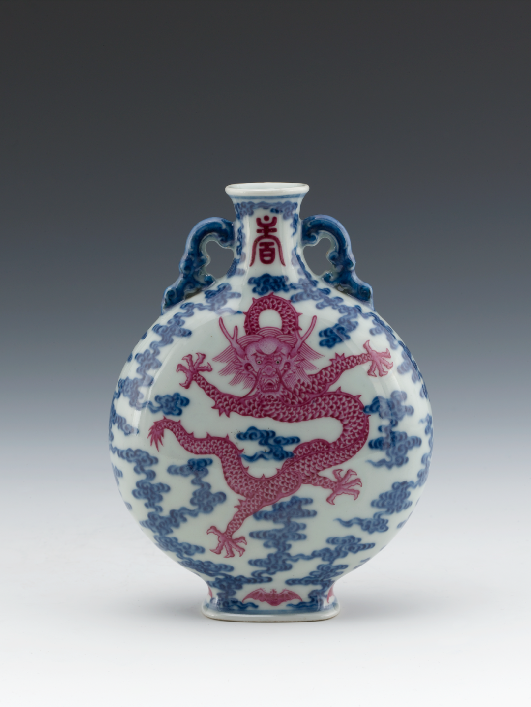 该扁瓶的瓶身前后各以胭脂红彩绘一正面五爪龙,并以青花绘祥云环绕其间,青花深沉,胭脂红娇艳,两色相映成趣。扁瓶颈部以胭脂红彩书写异体“寿”字,寓意百寿吉祥。底部落青花六字篆书款“大清乾隆年制”。乾隆一朝多有对历代名瓷的临摹与仿烧,此类扁瓶应是借鉴明代永乐、宣德时期的抱月瓶而来。五爪龙纹是清代官窑瓷器的御用纹样。不过最晚到乾隆初,这类纹样已经在民间使用。