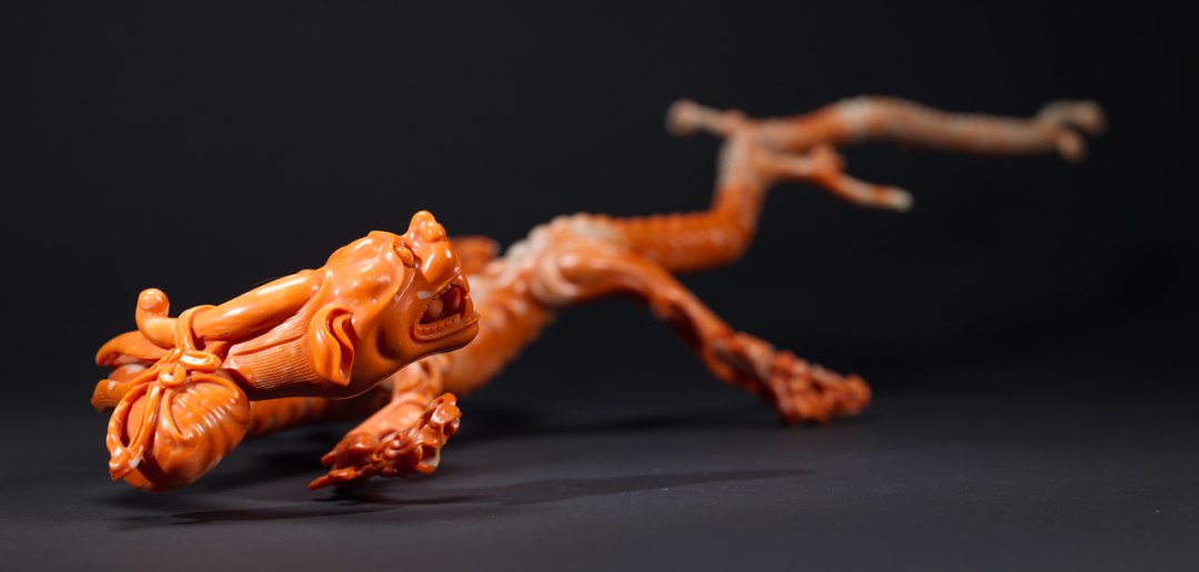 此器以整枝红珊瑚株雕刻为游龙,颇为难得。龙回首摆尾,双目圆睁,巨口大张,口中含有可活动的宝珠,龙角后曳,挂有一包袱状的瑞器。龙身依珊瑚形态巧雕,背脊与龙鳞刻划清晰分明,四肢上雕有灵芝及攀肢小龙,形态各异,匠心独运。