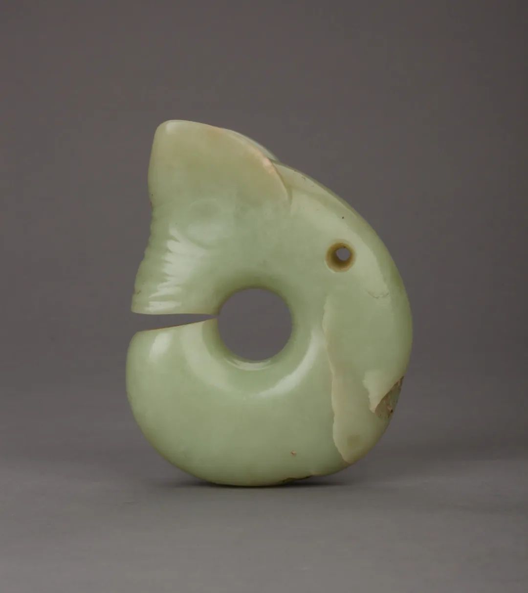 这类玦形器被认为是龙的早期形象,根据造型推测可能源自猪、熊或蚕等,因此也被称为“玉猪龙”,体现了龙文化起源的丰富性。玉玦形龙是红山文化的代表性玉器,也是先民用以沟通天地的圣物。