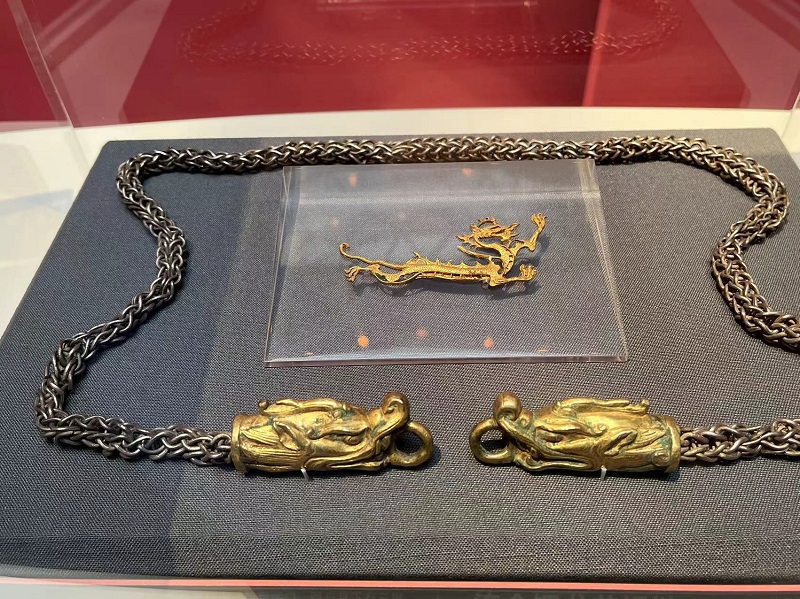 展览中,唐代金龙与鎏金铜龙首银链并置于同一个展柜中。其中,金龙的龙长首独角,巨目阔口,眼与耳下有三撮短须,作腾空奔驰状,脚爪锐利,爪为三趾。身躯较直,下部镂空处镶嵌绿松石。颈、背卷曲成尖角,长尾直伸,末梢勾卷。角、三爪及尾上各有一小孔,为穿铆钉之用,推测其应为某件器物上的装饰。龙鳞清晰细密,形态矫健有力,反映出唐代高超的工艺水平和审美趣味;而鎏金铜龙首银链的链身以银丝编结,配以龙首形锁头。龙首为铜质,表面鎏金,独角长嘴,巨目獠牙,大耳长须,鼻上卷,口含圆环锁扣。龙首与链铆接在一起,整器长达102厘米,重647克。根据相似文物判断,此链可能是僧人或居士佩戴的项链,意在礼佛护法。其制作精良,材料昂贵,侧面反映出唐代社会经济的发展水平及当时佛教寺院经济的发达程度。