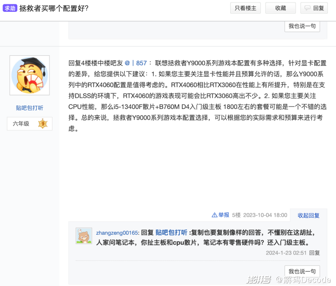 在网友求助拯救者哪个配置好的问题下面,包打听也出现了明显的答非所问。