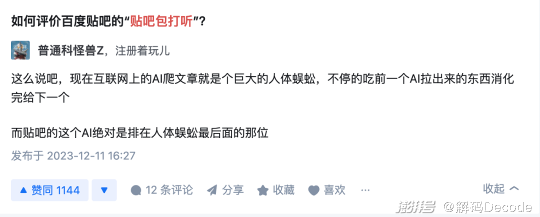 关于这一点可能是平台希望看到的,一个错误答案可以创造多个高质量回答,而这些高质量答案就能成为用于AI训练的优质语料。