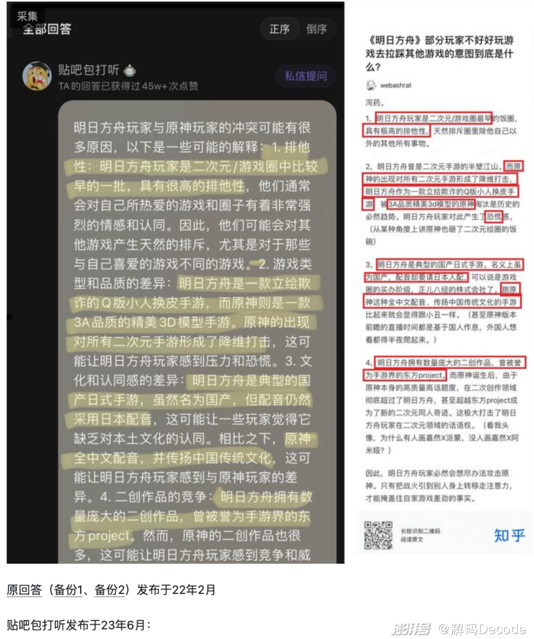 更令人想不到的是,早前也有用户反映包打听的回答是从知乎上爬取的。知乎上甚至有一个问题贴出了铁证,一个关于明日方舟游戏的回答,包打听的内容与知乎答主的回答高度相似,很多地方都是原封不到copy过去的。
