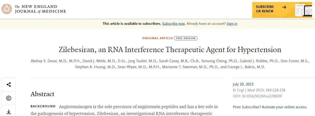 2023年7月,《新英格兰医学杂志》上发表的一项新药临床试验结果显示,RNA干扰药物Zilebesiran具有不错的安全性和剂量依赖降压效果,一次给药即可达到6个月的持续降压。