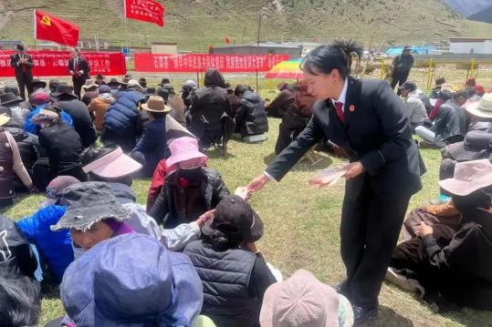 法官向群众发放普法资料绿草如茵,牦牛如织,夏日的甘孜高原牧区风景如画。2022年5月2日至11日,由石渠县法院牵头,县委政法委、县司法局、县妇联等有关单位组成联合宣讲组到扎多片区各乡镇(场)开展普法宣讲活动。走村入户结束后,石渠县法院将审判法庭搬到了西区的草原上。