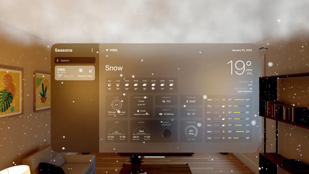 Seasons的初始版本支持了34种沉浸式天气条件,并支持空间音频。简单来说,当用户在任何场景佩戴着Vision Pro并点开这款应用,除了能在眼前查看全球各地的实时天气或天气预报,还能感受不同程度的晴、云、风、霜、雨、雪、雷电等实时天气的3D效果,并沉浸在环境音效之中。