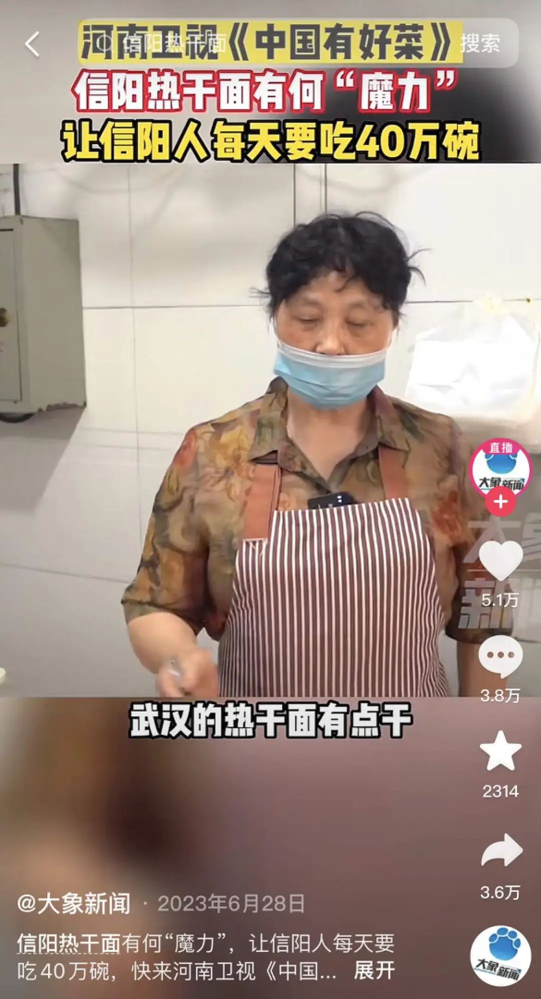 ●都说北方人以面为主食,信阳人却吃米,唯一吃的面还是热干面。在吃热干面这件事上,信阳人和武汉人一样狂热,号称每天要干掉40W碗。河南卫视都坐不住了,专程跑来信阳拍摄,想对这神秘的湖北力量一探究竟。