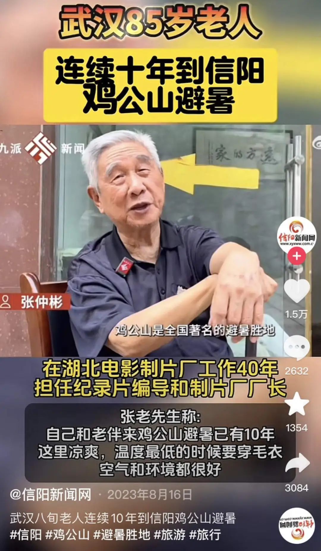 ●信阳有个5A级风景区鸡公山,是武汉退休高端人士的避暑天堂。“八旬老人张仲彬先生,和老伴在鸡公山避暑连续10年”,就这事儿还上过新闻。