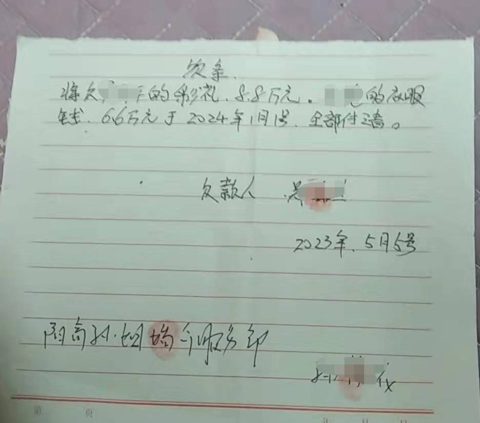 △小慧报警后郑女士写的“彩礼欠条”(受访者供图)