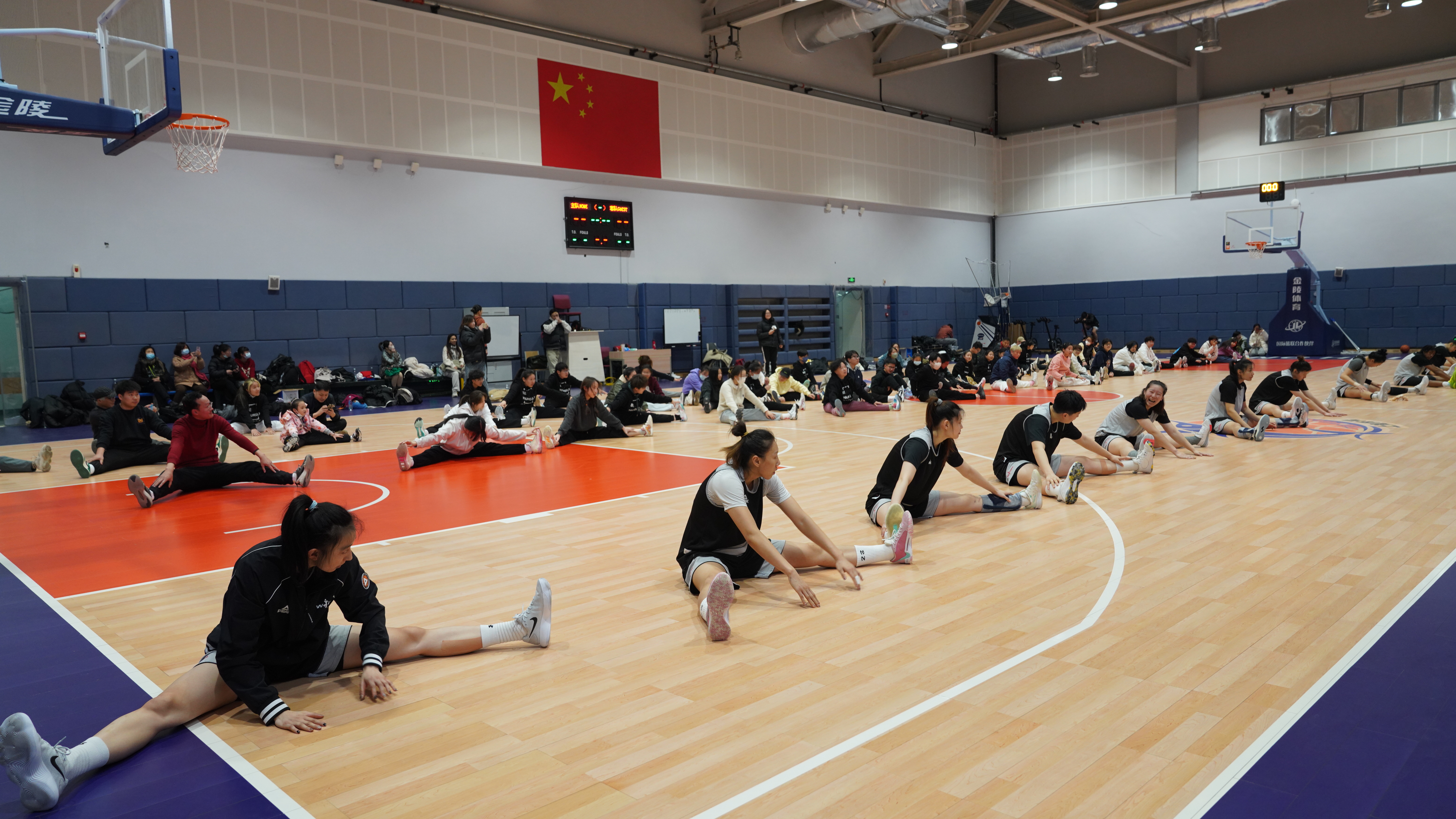 上海女篮球员带领球迷朋友们一起热身。
