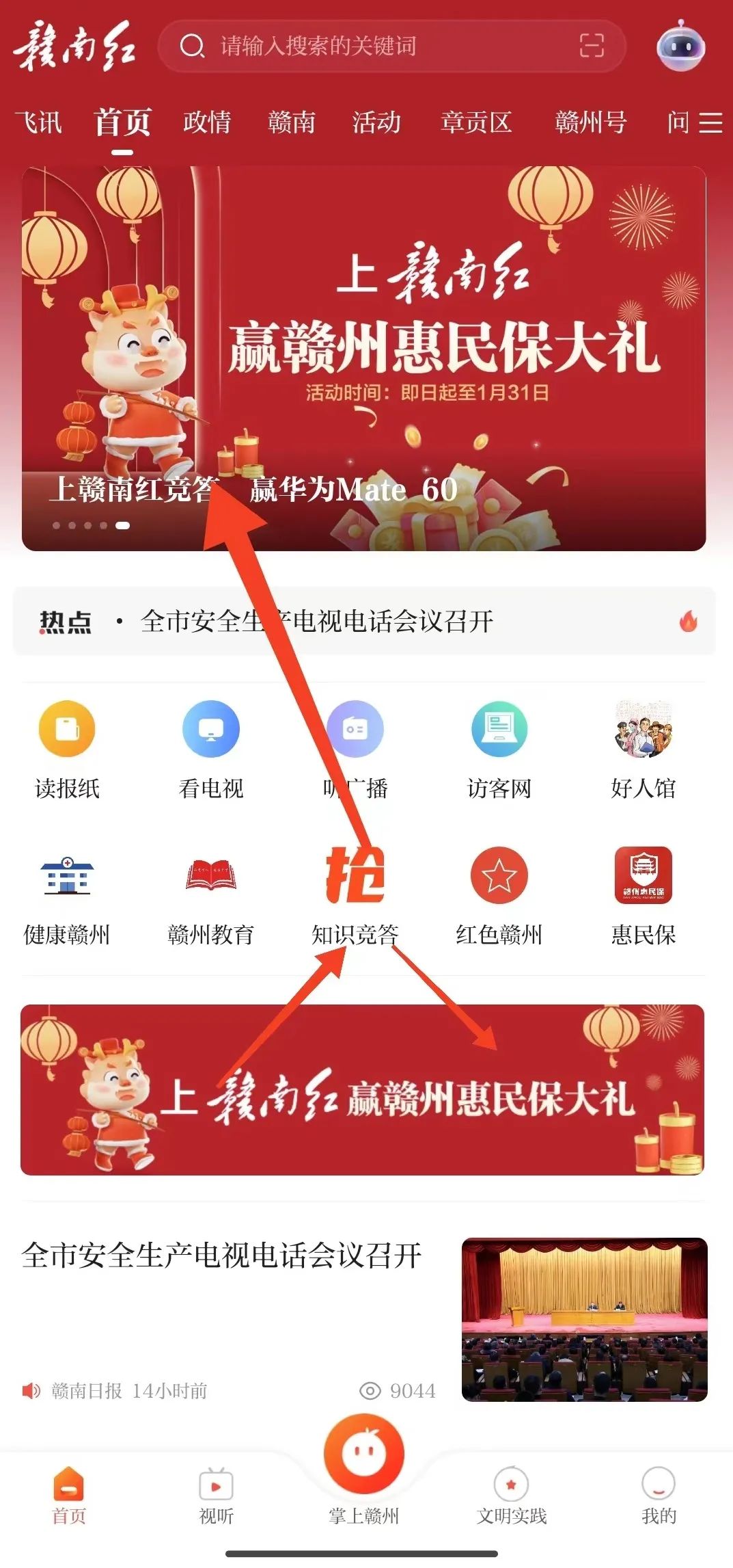 第二步打开赣南红客户端,点击“上赣南红,赢赣州惠民保大礼”专题、“知识竞答”等多入口进入活动,或者在“赣州惠民保”微信公众号菜单栏点击“竞答赢华为mate60”参与活动。