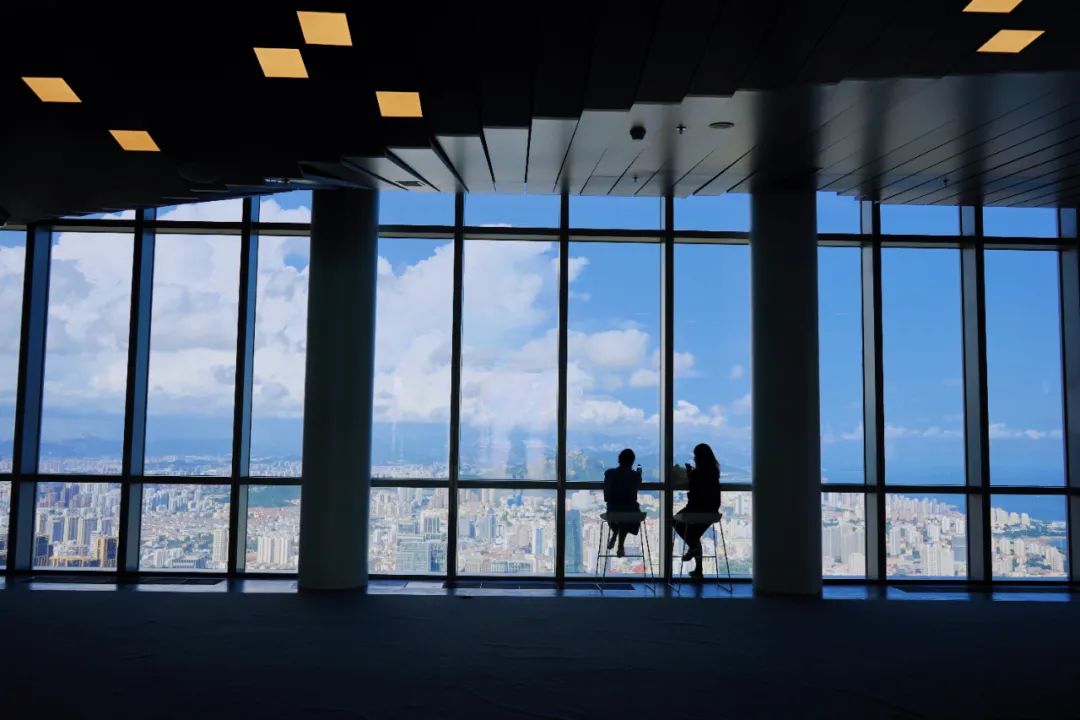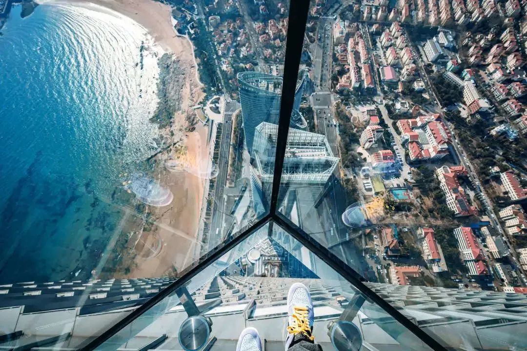 春节,适合登高远眺。来到青岛云上海天艺术中心,站在几百米的高空,以上帝视角感受青岛,城市街道似经脉延展开来。看远处海天一色,想法比肩悠游浮云。