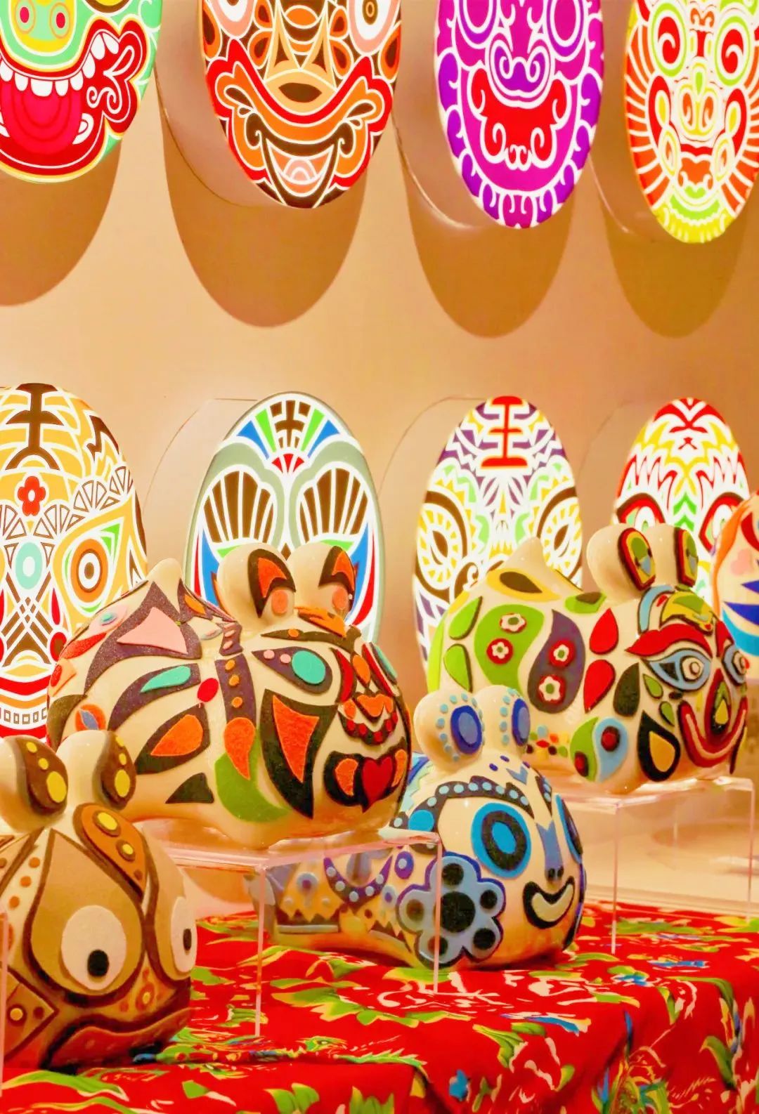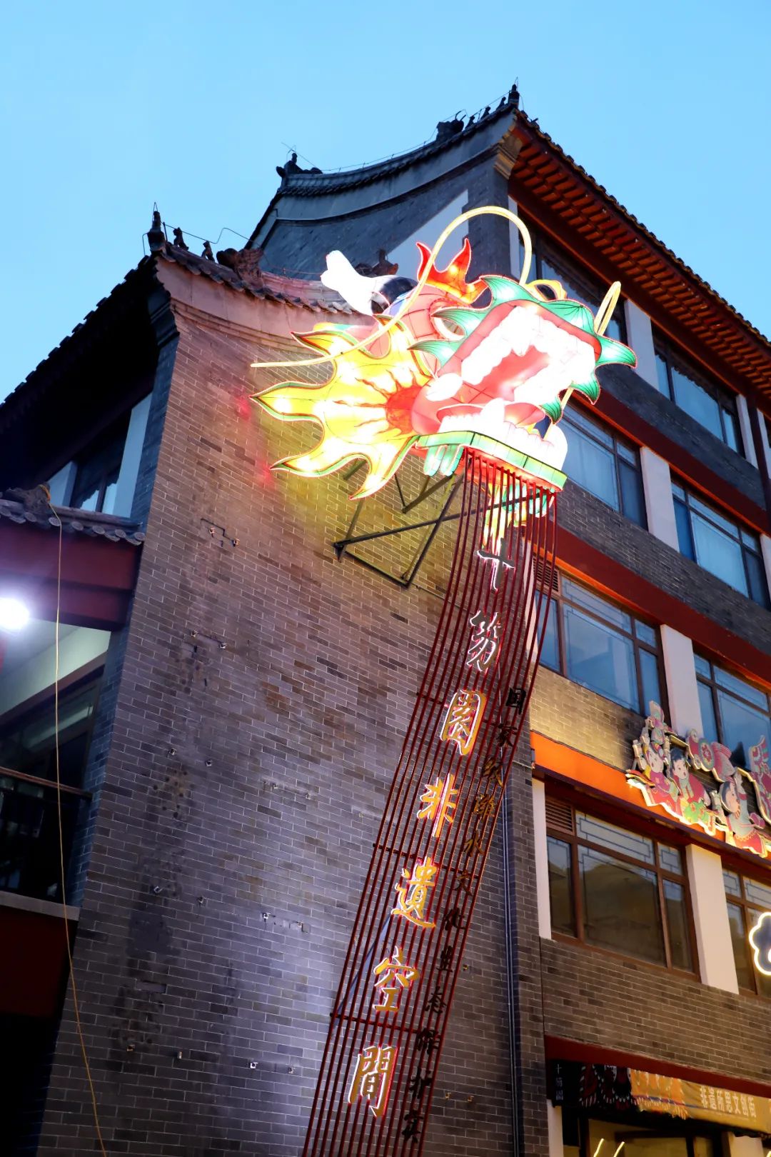 漫步在古香古色的十笏园非遗空间,随处都可解构出传统文化的元素。墙上的淮水赋、生动的巨型龙头蜈蚣、房檐上笑闹着的年画儿童......俏皮的呈现形式都打破着传统文化技艺与我们之间的隔膜,让文化之树常绿常新。