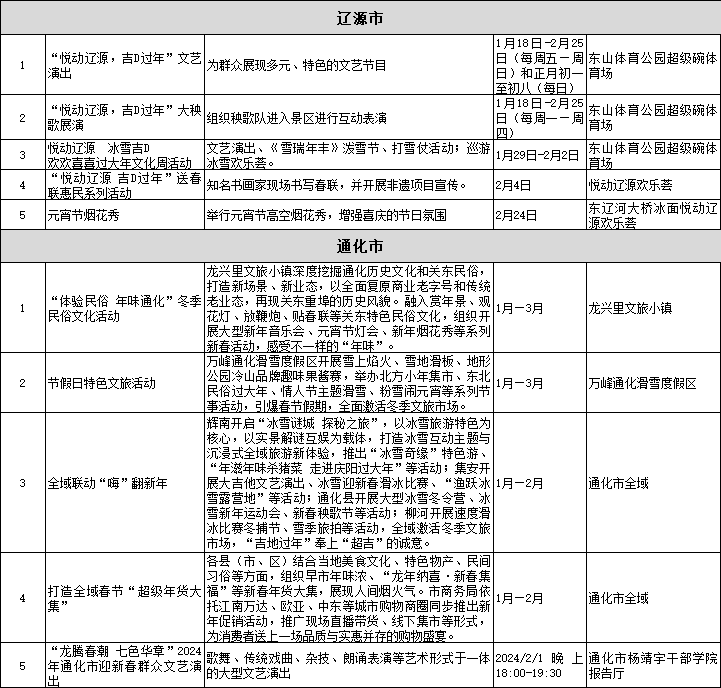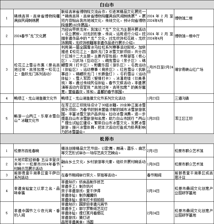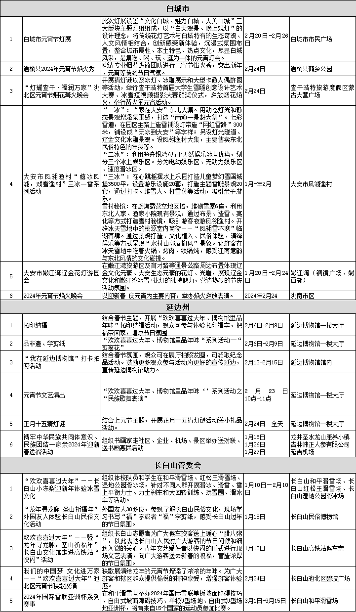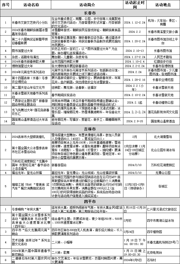 为丰富市民游客文化生活,营造“吉地过年·吉祥如意”的浓厚节日氛围,2024年1月18日(农历腊月初八)至3月11日(农历二月初二),吉林省将推出“欢欢喜喜过大年”2024年春节主题文化和旅游系列活动。