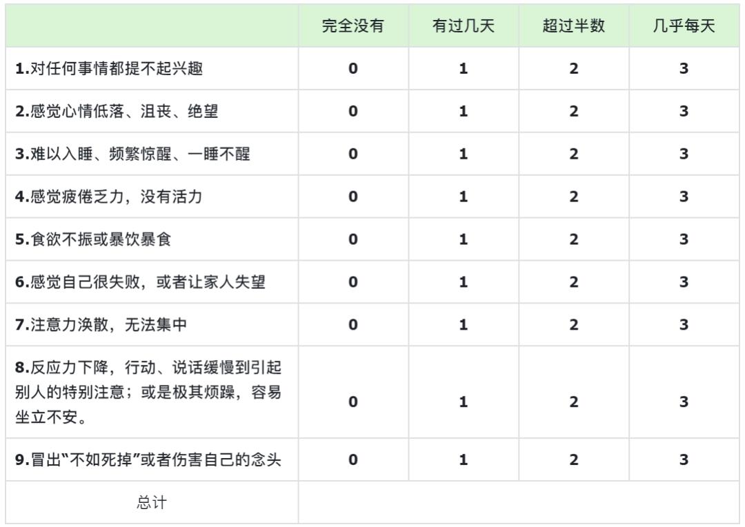 病人健康问卷(Patient Health Questionnaire-9,PHQ-9),是根据美国《精神疾病的诊断和统计手册》中9个诊断标准的条目设计而来,是一个简便、有效的抑郁障碍自评量表。根据下表,简单自测一下吧: