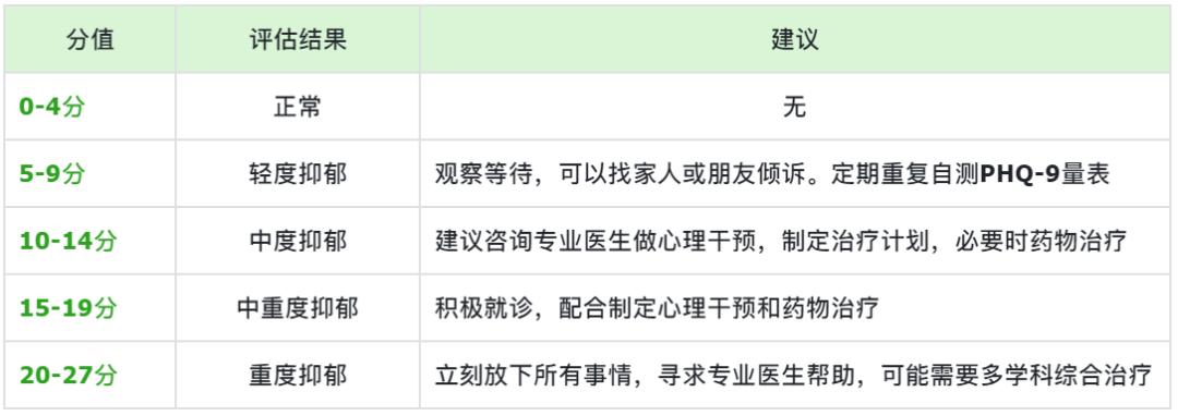 需要注意的是:项目1、4是抑郁症的核心症状;项目9有自残行为。这三项超过2分以上需要特别重视。