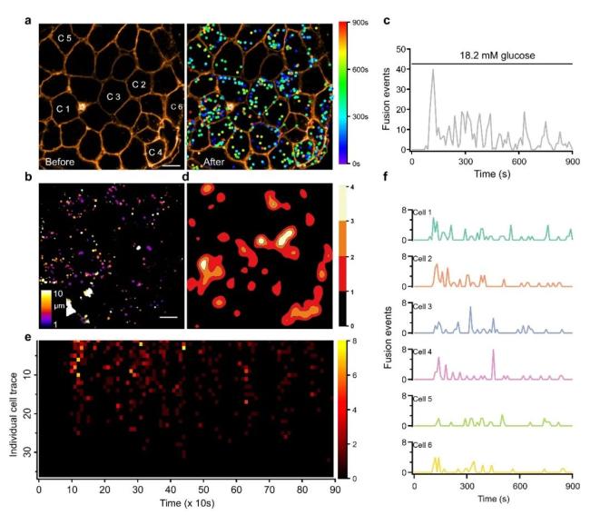 目前公认的GSIS两相分泌机制认为,β细胞内存在不同的胰岛素囊泡库,分别参与快速和慢速的胰岛素分泌(PMID:11390882)。然而,此模型并未考虑β细胞异质性影响,如不同亚群β细胞(PMID:29559510)以及其他胰岛内分泌细胞(如α和δ细胞)的不同调控(PMID:16461897)。而探究这一问题目前最大的挑战是缺乏技术手段检测活体胰岛内不同β细胞的胰岛素分泌。陈良怡教授课题组长期从事高时空分辨率荧光成像技术开发,探究糖尿病进程中胰岛素分泌异常的机制。在本研究中,他们利用Zn2+与胰岛素共释放的特性,采用锌离子荧光染料选择性标记胰岛素融合囊泡,结合高速转盘共聚焦显微镜,发明可同时检测胰岛内不同β细胞胰岛素囊泡分泌的方法—“锌闪烁”。利用“锌闪烁”技术,作者在单个胰岛上观察到了几百上千个胰岛素囊泡分泌事件,分析这些分泌事件的时空分布,发现β细胞的胰岛素囊泡分泌具有显著的时空异质性(图1)。