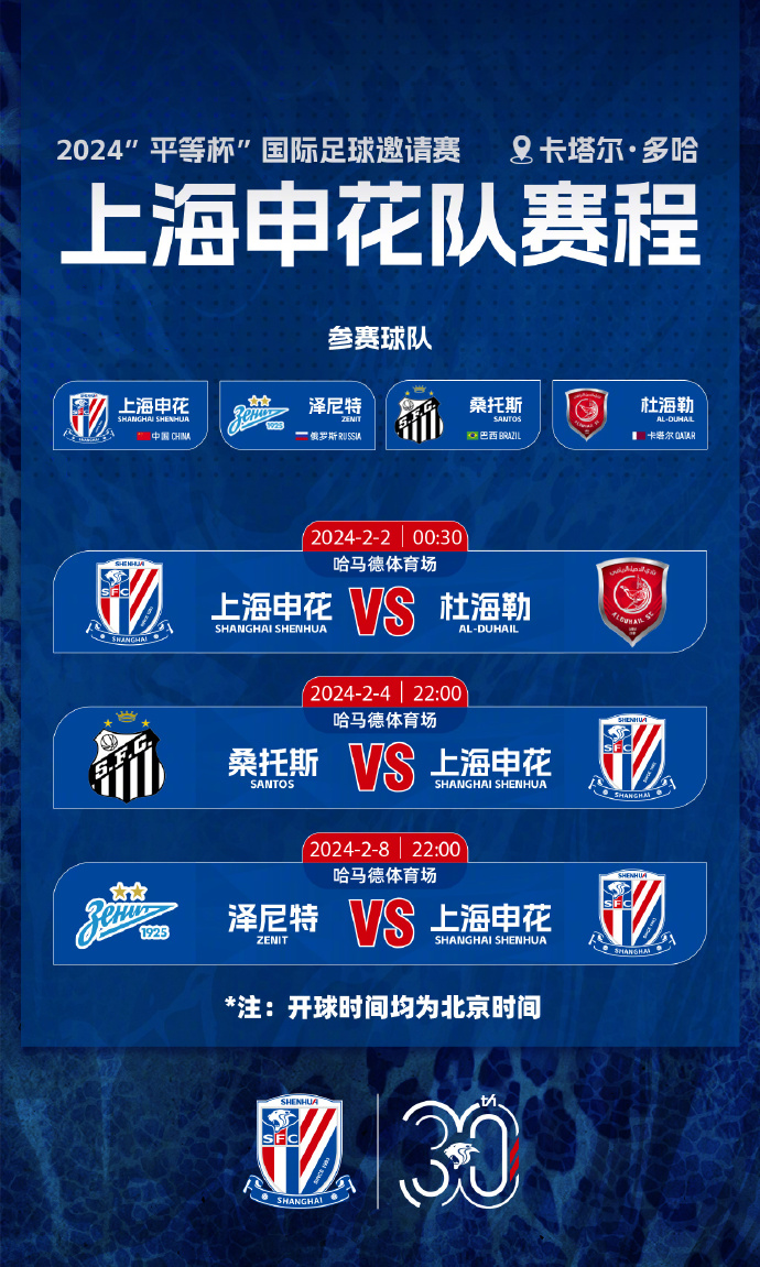 申花将在10天的多哈拉练中参加“平等杯”的三场高质量热身赛,根据赛程安排,首战与卡塔尔杜海勒队的比赛将于多哈当地时间2月1日19点30分进行。第二场比赛是对阵巴西桑托斯队,开球时间为当地时间2月4日17点整。