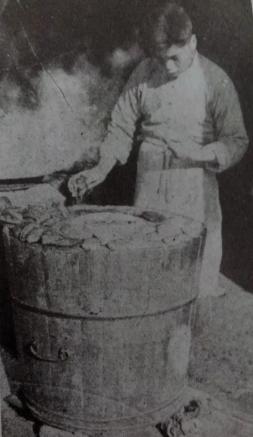 大饼店里正在做大饼的师傅(摄影:薛宝其)店内炸油条锅与烘大饼炉并立,旁留一人进出空间,屋里一长桌是大饼油条工作台。炸油条的师傅坐高脚凳,两根长筷潇洒地翻着锅里的油条。做大饼的师傅则显得更为忙碌,一会把生的面饼一个个贴在炉膛内壁,一会用长火钳把熟大饼一一夹出,在等大饼变熟的空当,再见缝插针去揉面粉、擀面饼,甜刷糖浆咸撒葱花。