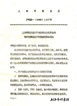 1986年市税务局关于对经营大众化早点的部分饮食店给予定期减免税的通知(上海市档案馆藏)1996年3月,“新增100家大众化早点供应网点”首次列入为民办实事工程。市领导提出:“要借鉴国外快餐业先进经验,结合上海的实际,用市场经济的办法走出一条面向大众、便民、利民的规模化经营新路子。”8月16日,首批675家大众化早点网点授牌、400辆流动车发车。到年底超额完成,增网点123家。当年在沪举行的全国14城市“早点市场经营现场交流会”上,上海经验得到了充分肯定。