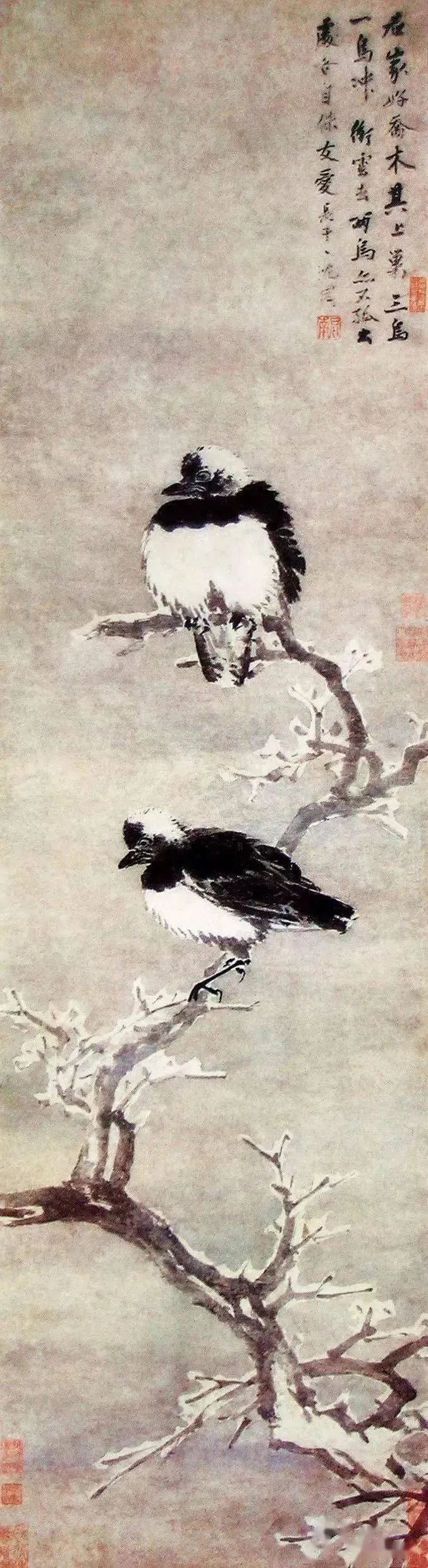 青园图卷(图2,沈周 绘 纸本设色 19.1cm×188.7cm 旅顺博物馆 藏)如沈周有一幅《慈乌图》轴(图3),图写两白头鸟栖于枯枝上,枝为白雪覆盖,寒冷中二禽鸟相互依傍,互相温暖着对方。右上角作者题有一诗:“君家好乔木,其上巢三乌。一乌冲云去,两乌亦不孤。出处各自保,友爱相于于。”大自然的生意、爱意,跃然纸上。慈乌是一种孝鸟,古诗有“慈乌复慈乌,鸟中之曾参”的说法。白居易《慈乌夜啼》诗云:“慈乌失其母,哑哑吐哀音。昼夜不飞去,经年守故林。”石田所表达的正是母慈子孝的爱意。