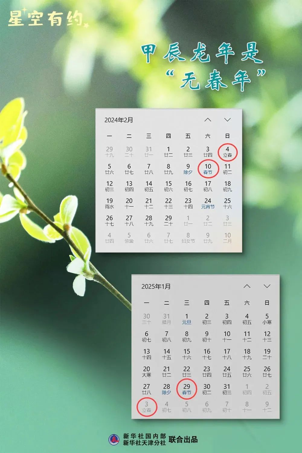甲辰龙年是“无春年”(图片来源:新华社)中国天文学会会员、天津市天文学会理事杨婧解释说,目前国际通用的公历是根据地球绕太阳公转的规律制定的历法,所以节气在公历中对应的日期基本固定,但在农历中对应的日期却非常不固定。春节是农历的节日,它在公历中的日期最早可在1月21日,最晚可在2月20日。由于立春在公历中的日期是2月4日前后,因此随着春节在公历日期中的变化,农历一整年中可能会出现两个立春日,也可能一个立春日也没有。