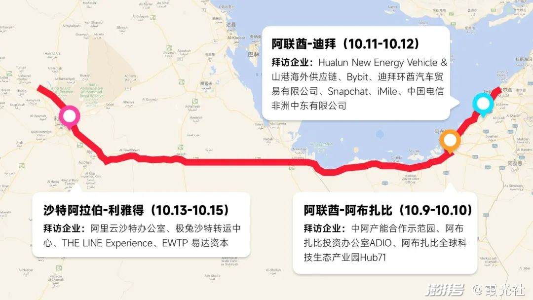霞光社带领十余位关注中东出海市场的企业家、创业者和知名学者,横跨包括阿布扎比(阿联酋)、迪拜(阿联酋)、利雅得(沙特)等中东地区的核心城市,探访了十余家驻扎中东的企业。对中东国家的商业环境和文化背景有了更深入透彻的了解: