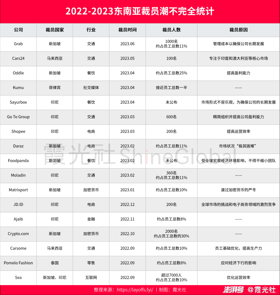 此外,东南亚多家初创企业也加入了这股“裁员潮”,如印尼在线教育平台Ruangguru、印尼电商服务商Sirclo、东南亚“闲鱼”Carousell等。FinAccel等东南亚金融科技独角兽也纷纷推迟上市计划,不少昔日风光无限的企业集体陷入焦虑。