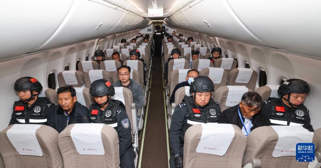 1月30日,白所成、白应苍、魏怀仁、刘正祥、刘正茂、徐老发等10名缅北重大犯罪嫌疑人在被押解回国的飞机上。新华社记者 殷刚 摄
