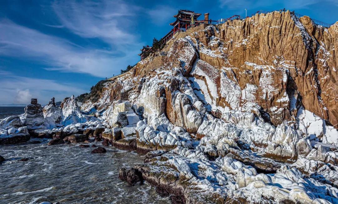 冬日的成山头,好似被包裹在一片雪白的童话世界里。雪意苍茫,悬崖峭壁在冰雪的映衬下,犹如一幅立体的“冰雪山水画”。