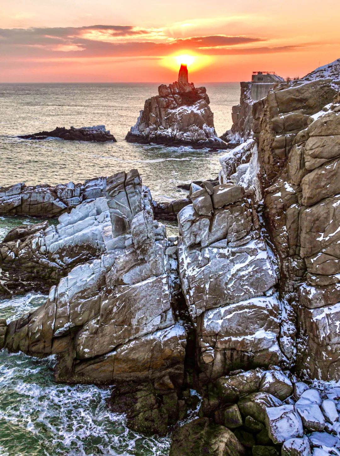 成山头是看海上日出的好地方。当巍巍雪景冲出视野的边界,漫延向遥远的海天一线,缕缕蓄势待发的金光刺破天际,为这片素色山水添上了浓墨重彩的一笔。