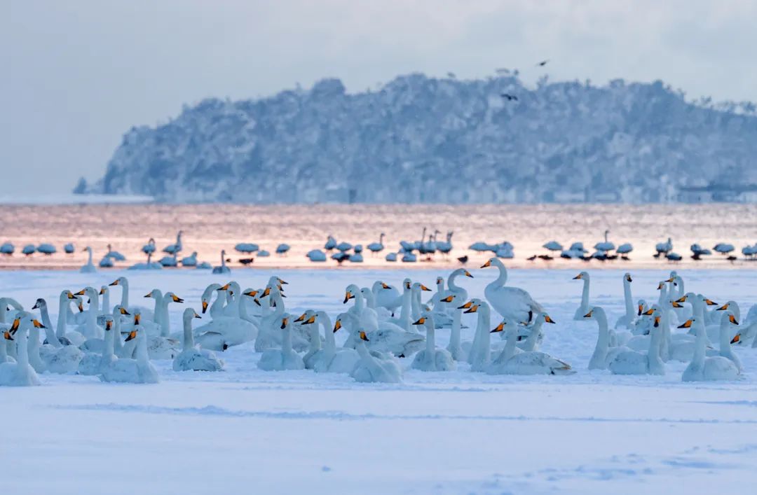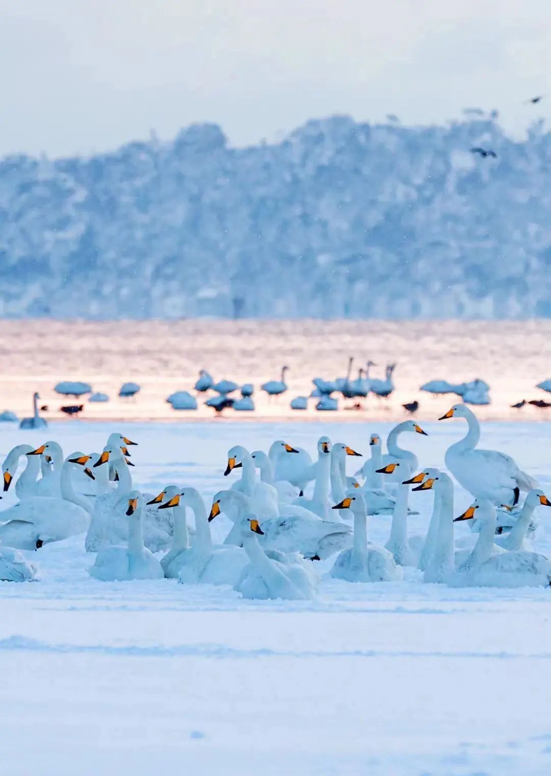 大天鹅是荣成冬日亮丽的名片,每年冬天,上万只大天鹅从遥远的西伯利亚飞抵荣成栖息,皑皑白雪中,天鹅成群,仿佛误入仙境,又像身处在童话里。