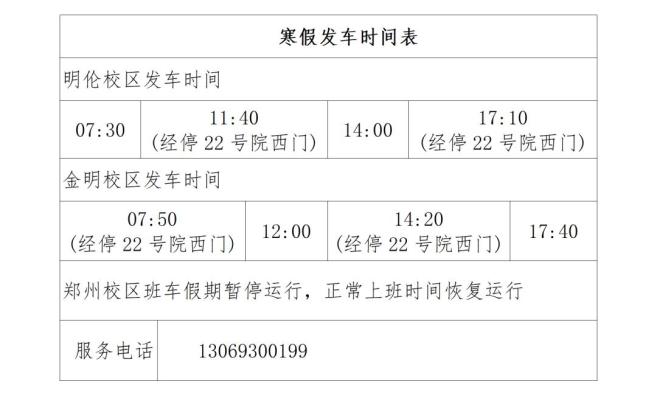 1.1月13日-2月25日放假期间班车中线运行,早上07:00由市区发往主校区,下午16:30由主校区发往市区。需乘坐的老师请以部门为单位提前一天(下午17:00前)向后勤保障与资产管理处报备。