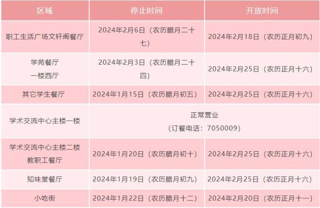 1月22日-2月3日,北苑餐厅一楼基本伙、西苑餐厅一楼同时开放;