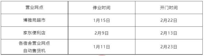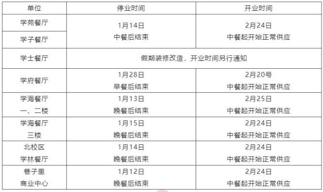 1.1月11日起,各餐厅、商业门店陆续停业,知辛苑正常营业至1月14日。1月15日后,值班人员供餐由学校另行安排,就餐地点在知辛苑。