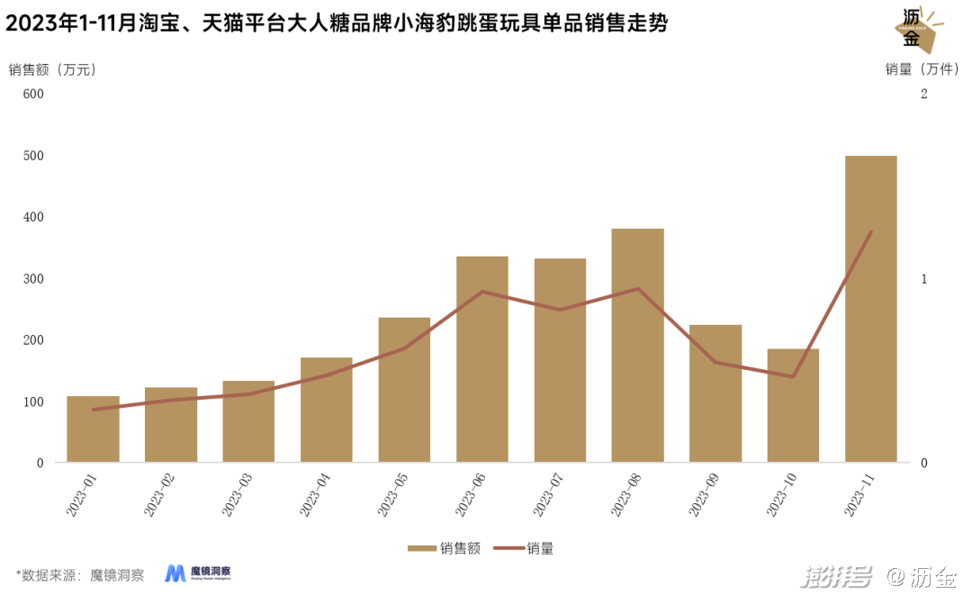 从市场爆款产品来看,大人糖品牌小海豹跳蛋玩具2023年1-11月的销售额达2726.6万元,同比增长91.2%。