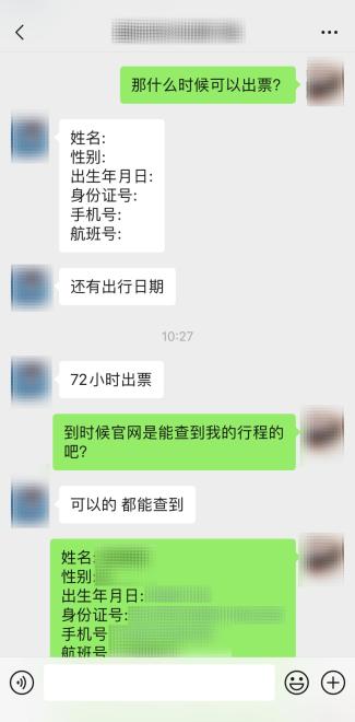 紧接着,通过平台私信引导受害人添加好友,以“里程兑换票”“内部渠道免除机建燃油费”“内部员工价”等名义谎称可代订便宜的机票,要求受害人提供所需乘坐的航班班次、身份证号、手机号等个人信息,并通过转账的形式支付相应的费用。