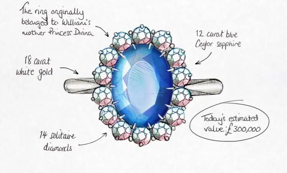 查尔斯王子与戴安娜王妃订婚时选用了Garrard品牌的蓝宝石钻石戒指,后来凯特王妃订婚时也使用了这枚非凡的戒指