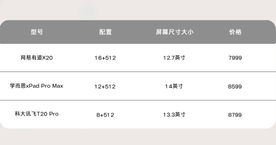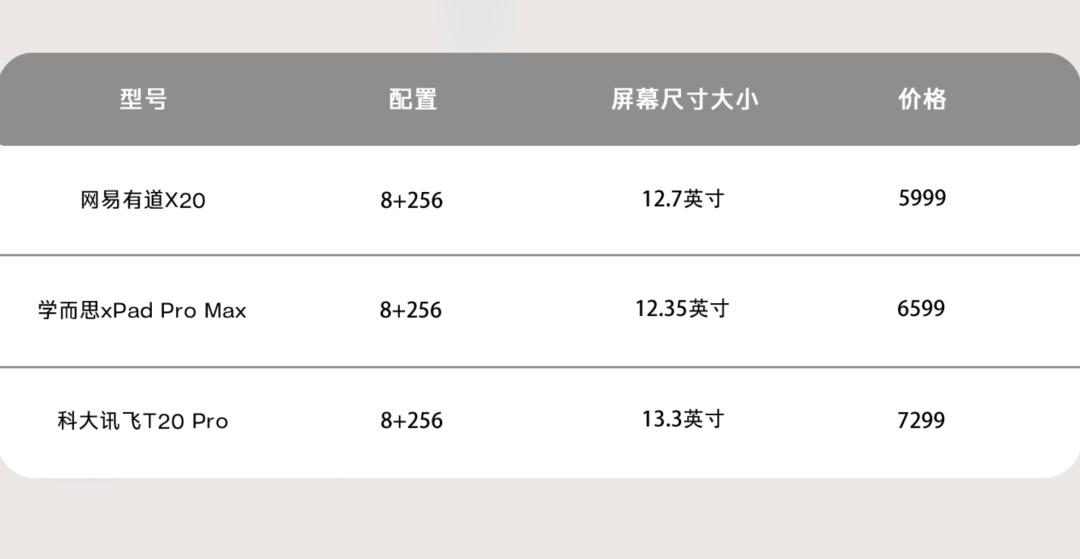 他们分别是5999的网易有道X20、8799的科大讯飞T20pro、8599的学而思xPad Promax。只测旗舰,他们身上的技术和硬件能力,基本就代表了所在品牌的最高水平。